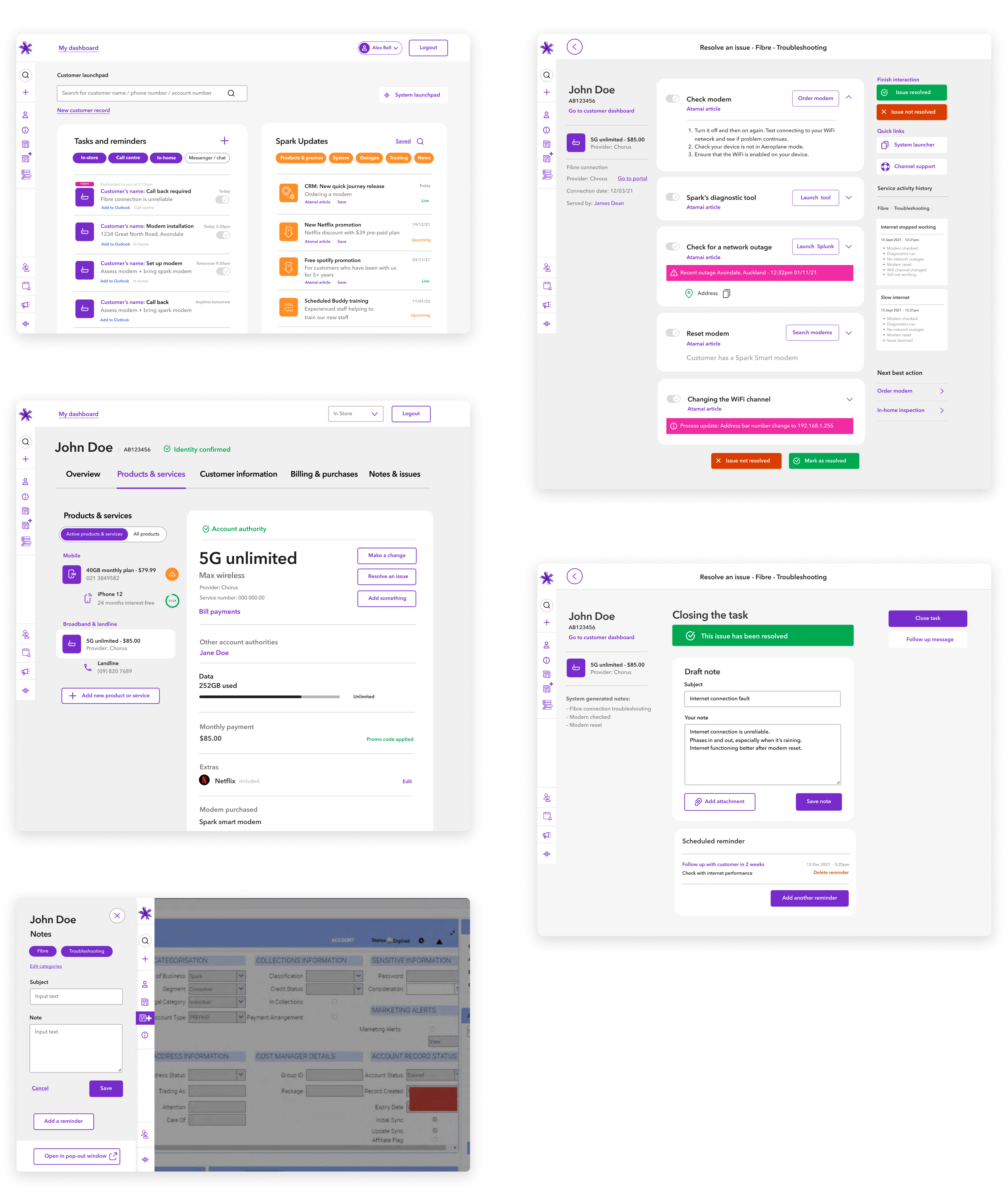 We generated multiple concepts by collaborating with the project team and leveraging the insights gathered. Together, we prioritised the highest-impact features and experiences, and a series of concepts and prototypes were generated and iterated with the Spark team. A key part of this exercise was leveraging the Spark design system to develop a desktop interface and design system for the front line aligned with the Spark customer digital experience.